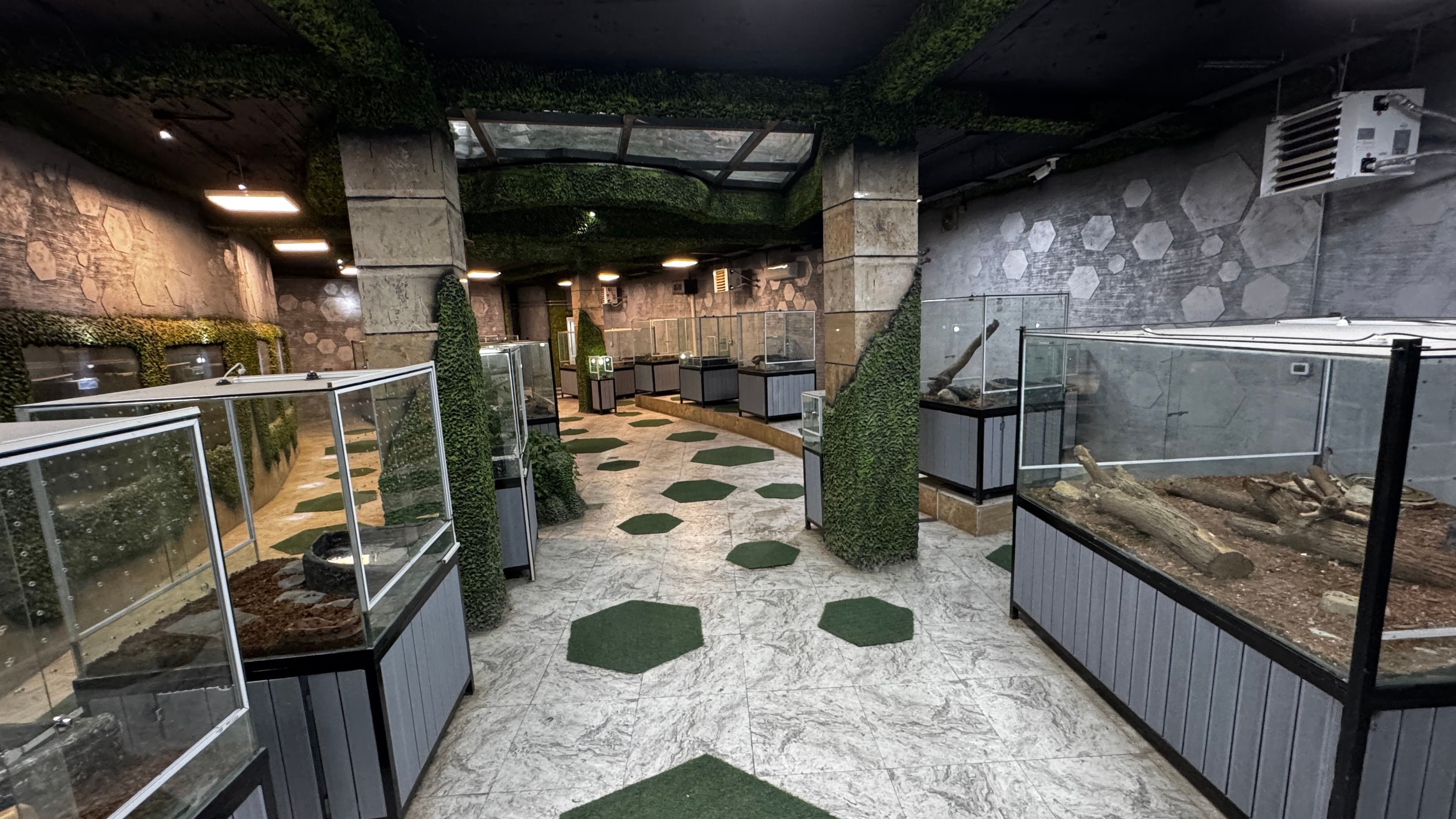 در طبقه همکف شما می توانید زیبا ترین باغ و همچنین موزه ای از خزندگان کمیاب دنیا را در شرایط نگهداری خاص از نزدیک مشاهده کنیدکه تعداد و نوع آن ها در جدول زیر آمده است. این گلخانه دارای 600 گلدان با درختان متفاوت از گونه های زینتی و سایه انداز و دو برکه مصنوعی که در آن ماهی های کوی قرار دارد مزین شده است در طبقه اول آن یک کافی شاپ کامل با نام کافه بهشت با ظرفیت 60 نفر دارای منوی بار سرد و گرم ، فست فود به صورت سرو و بیرونبر و قلیان برای بازدید کنندگان در نظر گرفته شده است